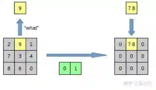 反池化其实很好理解,以下面的图片为例,左图可以表示是池化(pooling)过程,右图表示反池化(unpooling)过程,池化过程中我们将3*3的一个pooling块中的最大值取出,而反池化则是将pooling后的值恢复成3*3的像素单元,由于我们现在只有一个激活值, 所以只将该激活值对应原pooling块中位置的值还原回去 ,其他的值设定成0。所以在max-pooling的时候,我们不光要知道pooling值,同时也要记录下pooling值的对应位置 ,比如下图pooling值的位置就是(0,1)。