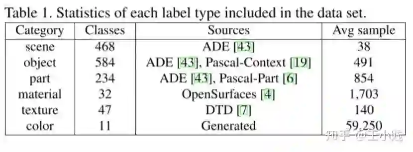 为了获得大量的视觉语义概念数据,研究人员收集了来自不同数据源的分层语义标注数据(包括颜色、材质、材料、部分、物体、场景这几个层次),如下图所示