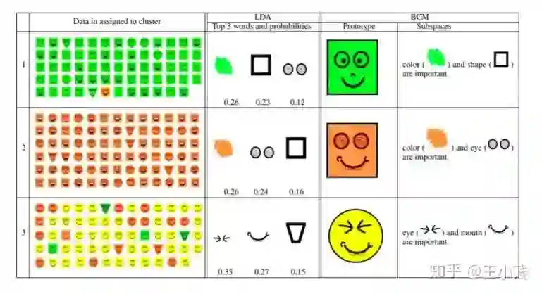 基于实例的方法 主要是通过一些代表性的样本来解释聚类/分类结果的方法。比如下图所展示的贝叶斯实例模型(Bayesian Case Model,BCM),我们将样本分成三个组团,可以分别找出每个组团中具有的代表性样例和重要的子空间。比如对于下面第一类聚类来说,绿脸是具有代表性的样本,而绿色、方块是具有代表性的特征子空间。