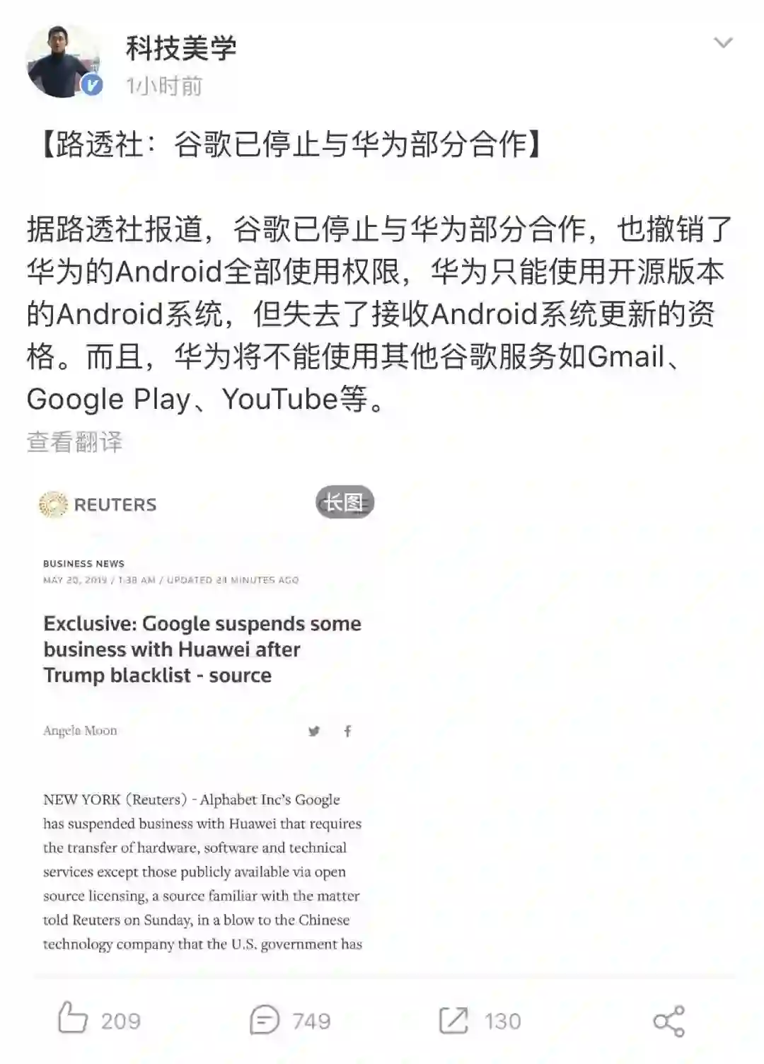 我们先回顾一下过程,5月20日,据路透报道,消息人士称谷歌母公司Alphabet已经停止与华为的业务,华为可能会在国外市场面临着升级Android版本、搭载谷歌服务等方面遇到困境。