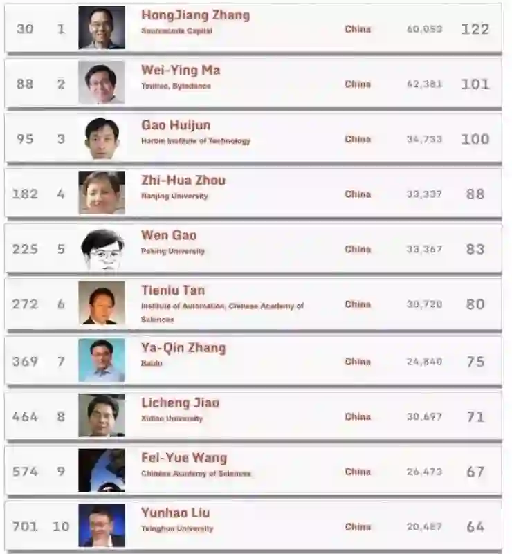 除了刚才已经提到的全球排名前 100 、分列中国籍学者前两位的张宏江、马维英之外,中国籍的学者 top 10 中的其它 8 位为: