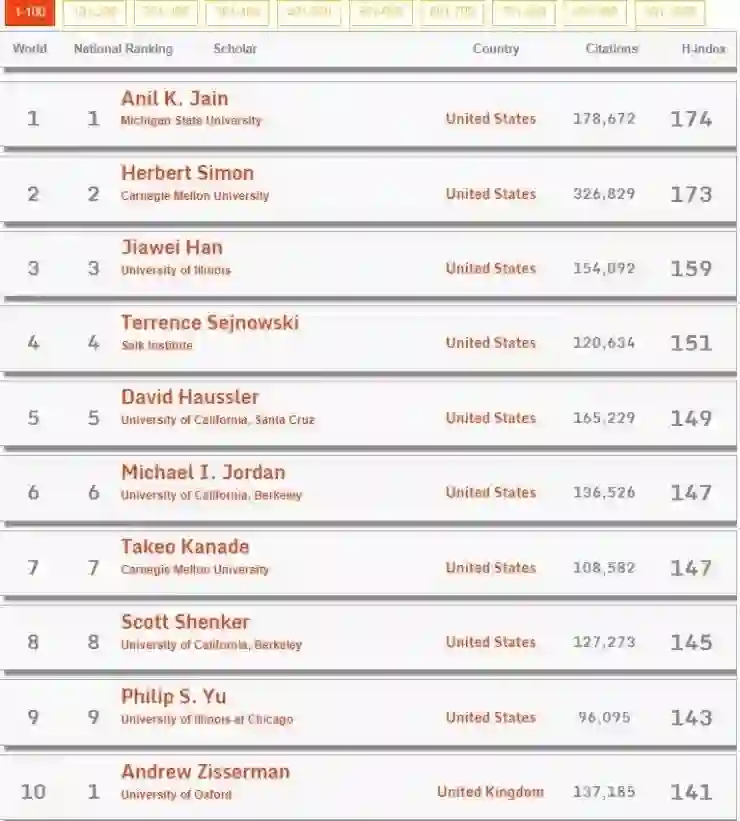 一眼就能看到的是,全球排名前 10 的学者里前 9 位都是美籍的,其中包括雷锋网 AI 科技评论非常熟悉的: