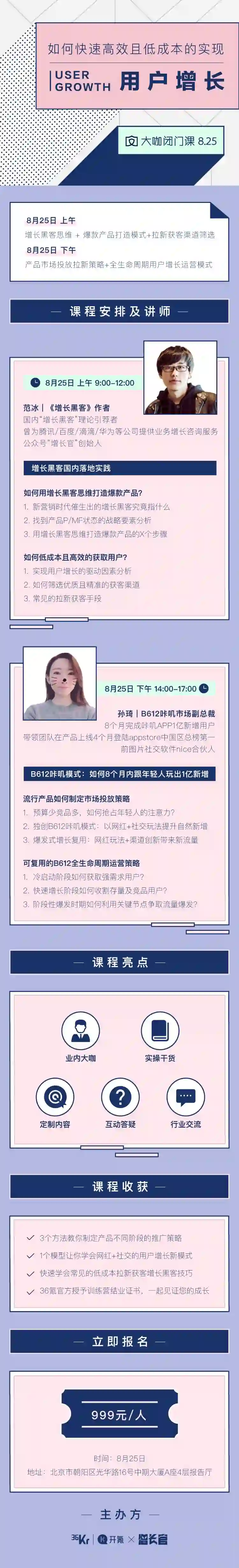 36氪开氪联合增长官将邀请专注研究增长黑客的范冰、B612咔叽市场副总裁孙琦共同打造历时1天的深度闭门课——《如何快速高效且低成本的实现用户增长》