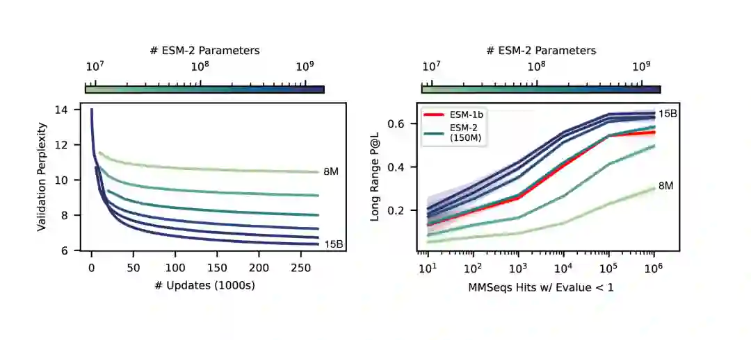 随着ESM-2规模的增加,可以观察到语言建模的精度有很大的提高。