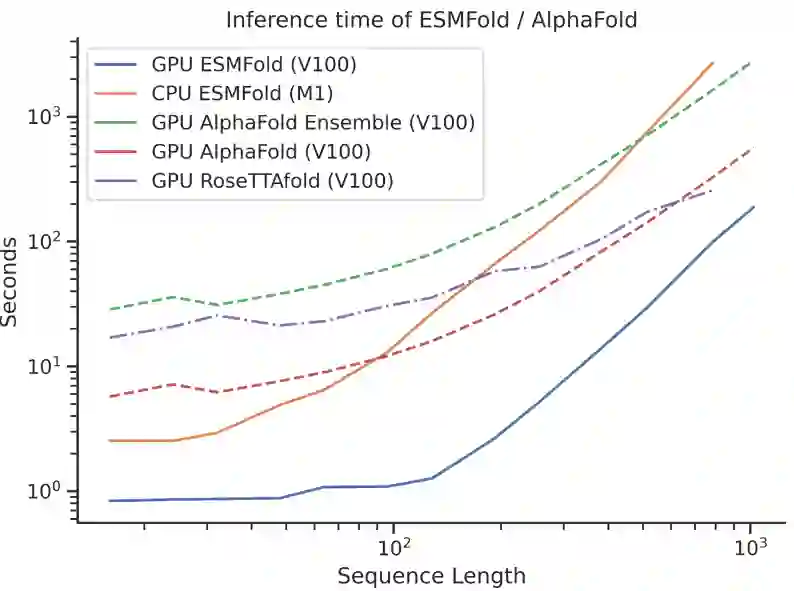 ESMFold获得了准确的原子分辨率结构预测,推理时间还比AlphaFold2快了一个数量级。