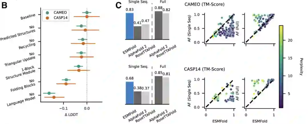 研究人员将ESMFold与AlphaFold2和RoseTTAFold在CAMEO(2022年4月至2022年6月)和CASP14(2020年5月)测试集上进行比较。
