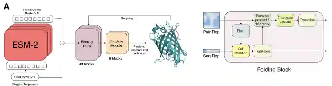 ESMFold通过用一个处理序列的Transformer模块取代处理MSA的计算昂贵的网络模块,简化了AlphaFold2中的Evoformer。这种简化意味着ESMFold的速度大大提高,远高于基于MSA的模型。