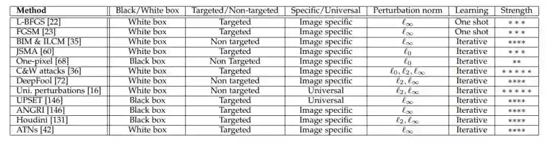 表 1:以上列举的各种攻击方法的属性总结:「perturbation norm」表示其限制的 p-范数(p-norm)以使对抗扰动对人类不可见或难以察觉。strength 项(*越多,对抗强度越大)基于回顾过的文献得到的印象。