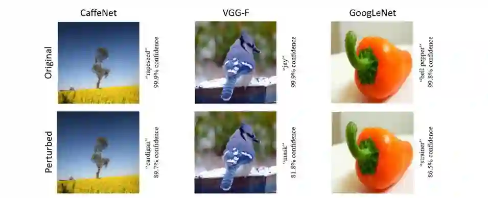 诸如 FGSM [23]、 ILCM [35]、 DeepFool [72] 等方法只能生成单张图像的对抗扰动,而 Universal Adversarial Perturbations[16] 能生成对任何图像实现攻击的扰动,这些扰动同样对人类是几乎不可见的。该论文中使用的方法和 DeepFool 相似,都是用对抗扰动将图像推出分类边界,不过同一个扰动针对的是所有的图像。虽然文中只针对单个网络 ResNet 进行攻击,但已证明这种扰动可以泛化到其它网络上。