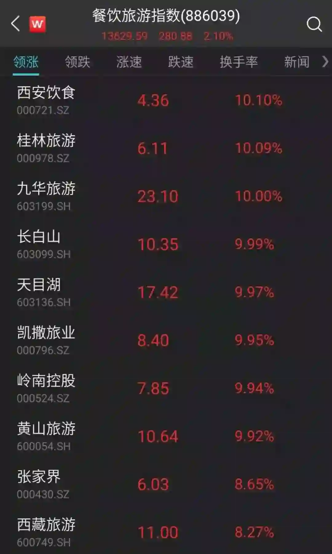 午后,春节相关行情升温。旅游板块持续走强,凯撒旅业、桂林旅游、西安饮食、九华旅游、天目湖、岭南控股等多股涨停。