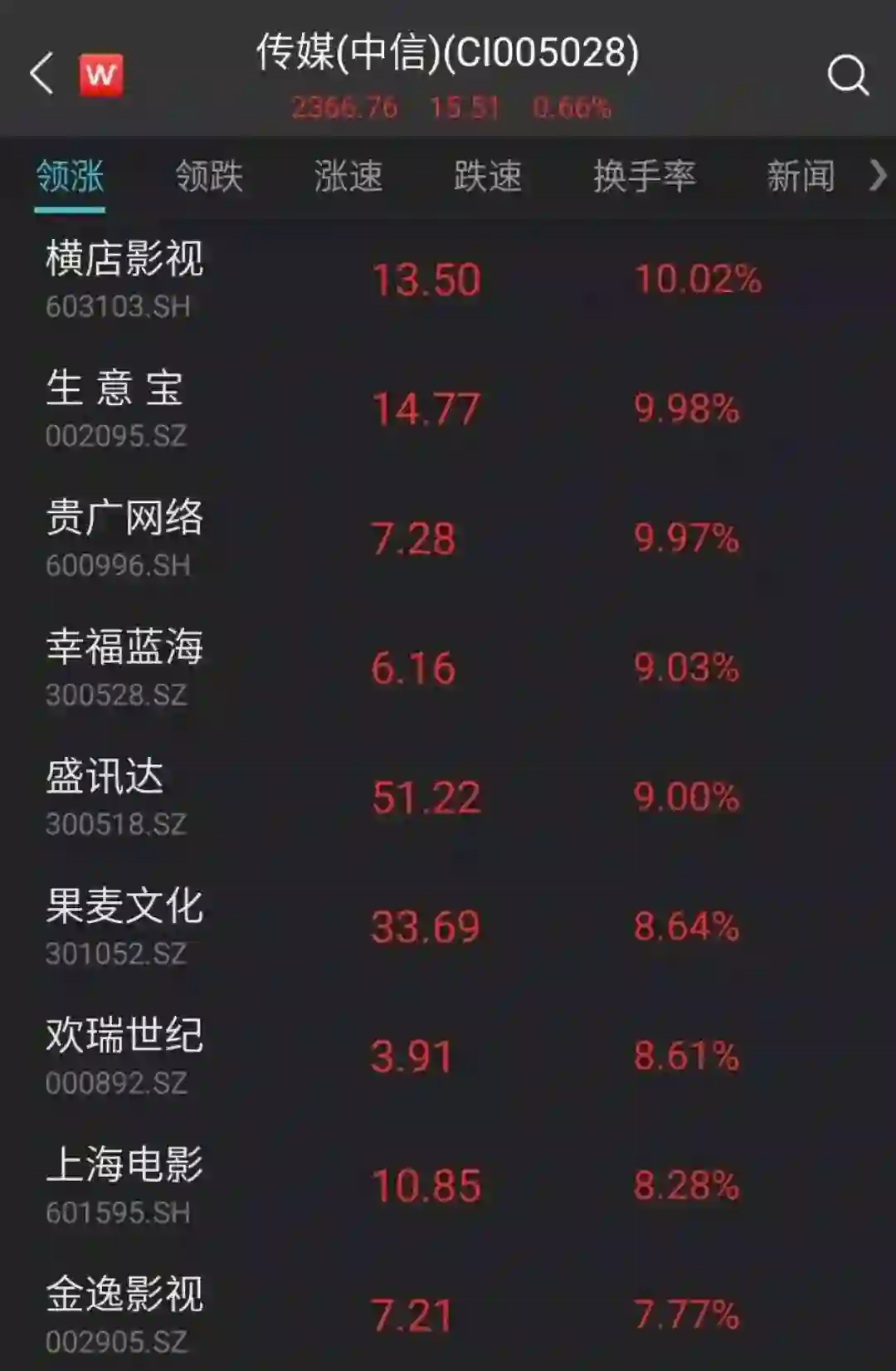 影视传媒板块继续走高,横店影视涨停,幸福蓝海、金逸影视、上海电影、果麦文化等跟涨。