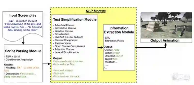 这个网络由几个部分组成: 一个可以自动将文本与剧本场景描述隔离开的脚本解析模块、一个自然语言处理模块(使用一套语言规则简化复杂句子,并从简化句子中提取信息,转化为预定义的动作表示),以及一个将所述表示转换为动画序列的生成模型。