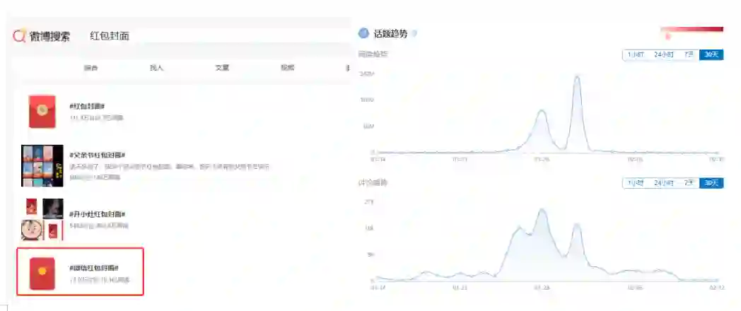 接着,我搜索了关键词“红包封面”,选择了阅读量最高的话题查看,发现其阅读趋势在1月28日时出现第一个高峰,阅读量约为1.3亿;在1月31日出现第二个高峰,阅读量约为2.4亿。