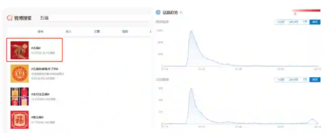 首先,我搜索了微博“五福”话题下阅读量最高的话题,该话题拥有20.7亿阅读。从近一个月的话题趋势中可以发现,该话题最高阅读量在1月19日达到1.2亿,后持续下降。