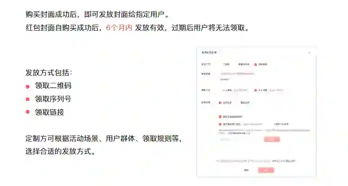 红包封面的发放方式有三种,分别是:扫描二维码、输入序列号、点击链接,商家可以根据使用场景灵活选择。