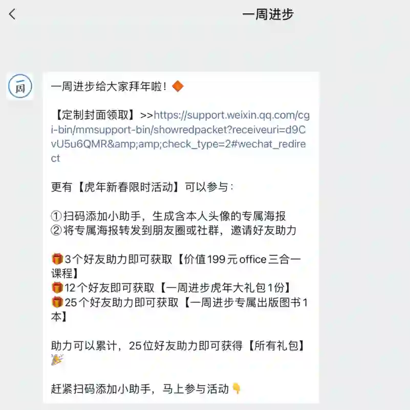 还可以引导在回复语中配置其他活动信息,比如一周进步公众号,在用户回复关键词后弹出了虎年新春活动的营销信息,正可谓是将流量用到了极致。