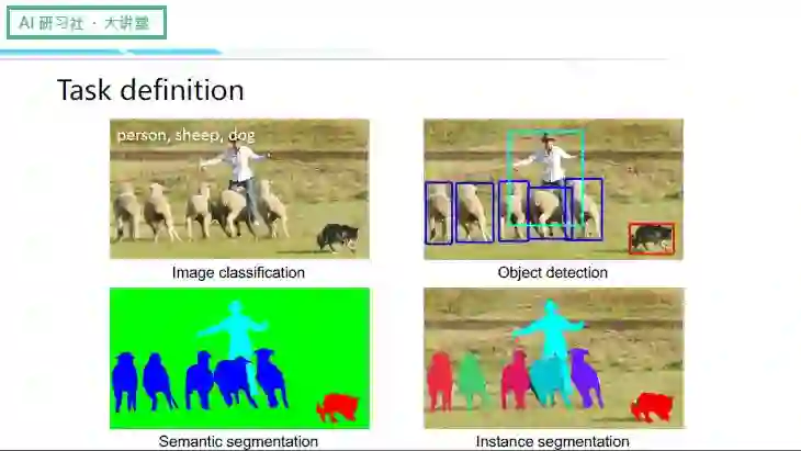 Semantic segmentation:语义分割,这个任务是指对图片中的每个 pixel 打上标签,比如这里要给它们打上 person、sheep、dog 的标签,需要进行非常精细的分类。