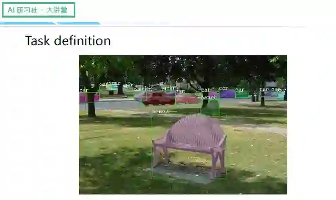 Instance segmentation:实例分割,可以理解为进行物体检测后,对每个矩形框中的物体进行语义分割,该任务除了需要找到物体的类别和位置之外,还需要分辨出不同物体的 pixel。