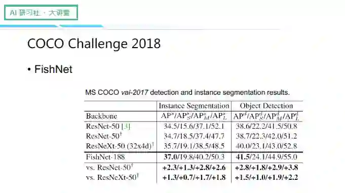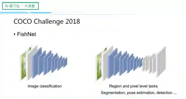 FishNet 这个工作的论文被 NIPS 2018 收录了。它的想法是:对于图像分类来说,需要的是深层的、低分辨率的特征,而不考虑空间上的信息;但是对于 segmentation 和 detection 来说,需要空间上的信息,因此需要的是深层的和高分辨率的特征,因此我们就将这两种思路结合起来设计了 FishNet。具体设计大家可以参考论文。