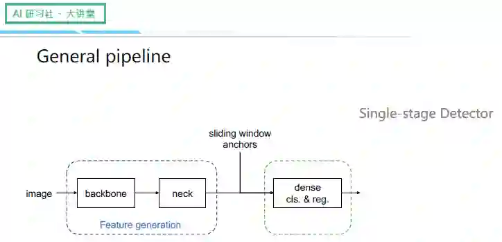第一部分是 Feature generation:首先图片经过 backbone(分类网络)后,会生成 feature; 之后 feature 或者直接进行 prediction,或者再过一个 neck 进行修改或增强;