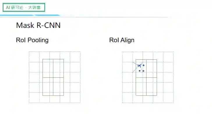 RoIAlign:在 Mask R-CNN 之前,大家用得比较多的是 Rol Pooling,实现过程是:给出一个框,在 feature map 上 pool 出一个固定大小的 feature,比如要 pool 一个 2×2 的 feature,首先把这个框画出 2×2 的格子,每个格子映射到 feature map,看它覆盖了多少个点,之后对这些点做 max pooling,这样就能得出一个 2×2 的 feature。它的劣势是如果框稍微偏一点,得出的 feature 却可能是一样的,存在截断误差。Rol Align 就是为了解决这一问题提出的。Rol Align 并不是直接对框内的点做 max pooling,而是用双线性插值的方式得到 feature。其中还有一步是:在 2×2 的每个框中会选择多个点作为它的代表,这里选择了 4 个点,每个点分别做双线性插值,之后再让这 4 个点做 max/average pooling。