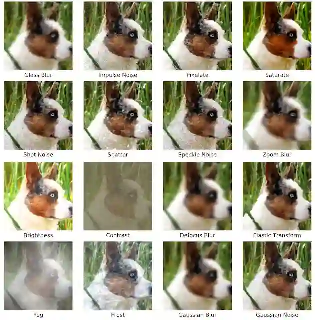 我们探索了模型不确定性在数据分布发生变化时的行为方式,例如在 Corrupted Imagenet 中使用的图像扰动强度增加。此处展示的是强度级别 3(共 5 个级别)中每种类型的图像损坏示例