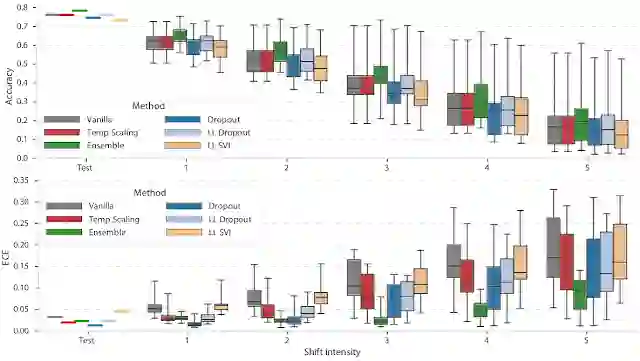 与预期相同,随着偏移强度增强,每个模型的破坏方法精确度偏差也会增加(箱会变大),而且总体精确度会下降。理想情况下,这将在模型不确定性增加上有所反映,预期校准误差 (ECE) 也会因此保持不变。然而,从下面的 ECE 箱型图来看,发现情况并非如此,而且校准通常也会受到影响。在布莱尔评分 (Brier Score)和负似然对数 (NLL)中,我们也观察到了类似的恶化趋势,这表明模型并不会随着偏移而变得越来越不确定,而是会给出错误判断。