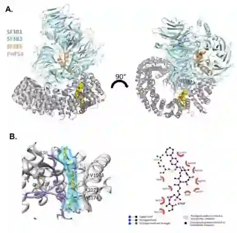 RNA剪接异常与癌症具有密切联系。在骨髓癌、淋巴癌、皮肤癌以及乳腺癌等多种常见癌症中均发现了剪接体蛋白组分的体细胞突变。这些癌症相关的突变大多数都分布在剪接体SF3b复合物的组分SF3b1这个蛋白上,因此SF3b1一直是治疗癌症的重要靶向之一。第一个进入临床实验的剪接体靶向药物是E7107,体外的生化实验表明E7107可以特异性结合SF3b1,并抑制剪接反应,但其作用机理尚不明确。