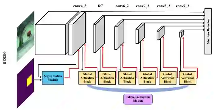 摘要:We propose a novel single shot object detection network named Detection with Enriched Semantics (DES). Our motivation is to enrich the semantics of object detection features within a typical deep detector, by a semantic segmentation branch and a global activation module. The segmentation branch is supervised by weak segmentation ground-truth, i.e., no extra annotation is required. In conjunction with that, we employ a global activation module which learns relationship between channels and object classes in a self-supervised manner. Comprehensive experimental results on both PASCAL VOC and MS COCO detection datasets demonstrate the effectiveness of the proposed method. In particular, with a VGG16 based DES, we achieve an mAP of 81.7 on VOC2007 test and an mAP of 32.8 on COCO test-dev with an inference speed of 31.5 milliseconds per image on a Titan Xp GPU. With a lower resolution version, we achieve an mAP of 79.7 on VOC2007 with an inference speed of 13.0 milliseconds per image.