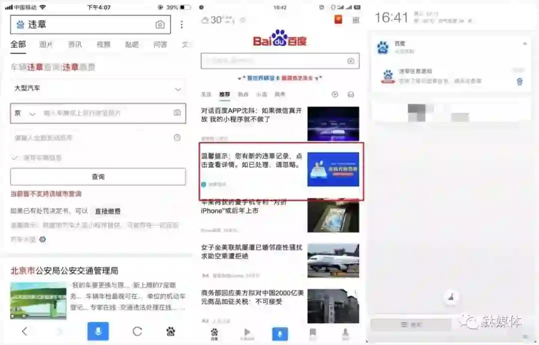 3、对于使用过查违章小程序的用户,一旦有了新的违章信息,会在百度 APP 的信息流中显示提醒页面。