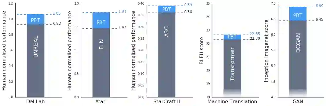 PBT也在Google的机器翻译神经网络上进行了实验。作为谷歌最先进的机翻工具,这些神经网络使用的超参数优化方法是手动调试,这意味着在投入使用前,它们需要按照研究人员精心设计的超参数时间表进行长达数月的训练。使用PBT,计算机自动建立了时间表,该训练计划所获得的模型性能和现用方法差不多,甚至更好,而且只需进行一次训练就可以获得满意的模型。