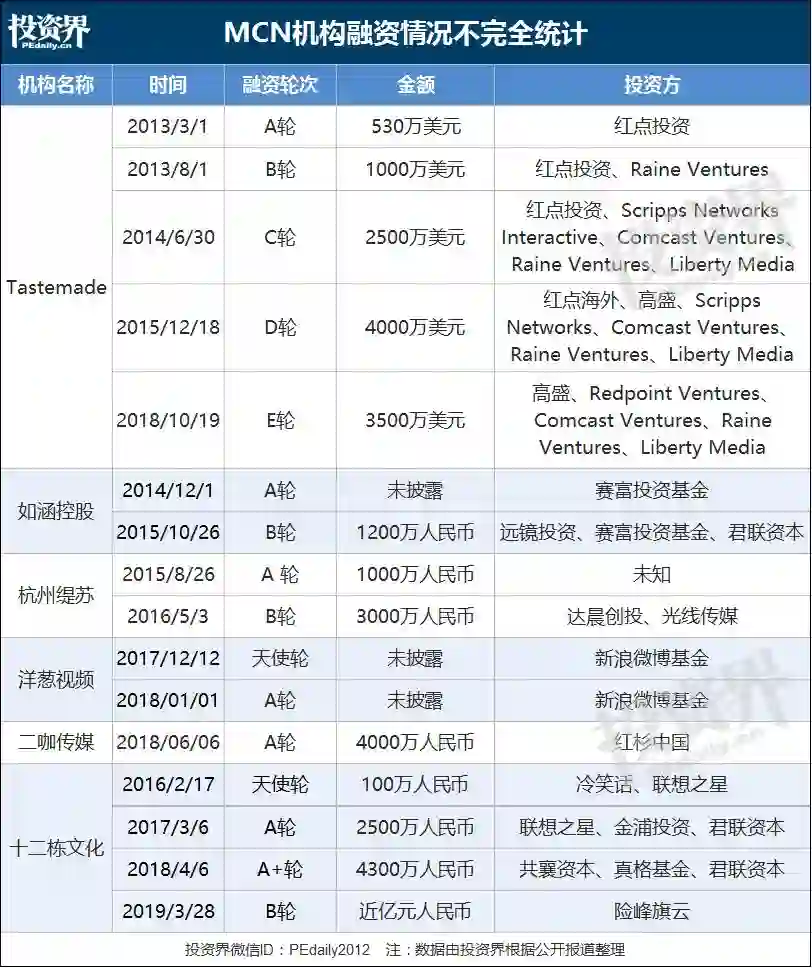 对于近年来MCN机构融资情况,投资界进行了不完全统计,除去2013年在海外成立、专做全球美食视频Tastemade已经拿到E轮融资外,目前为止,其他知名的MCN机构融资均停留在B轮及以前。