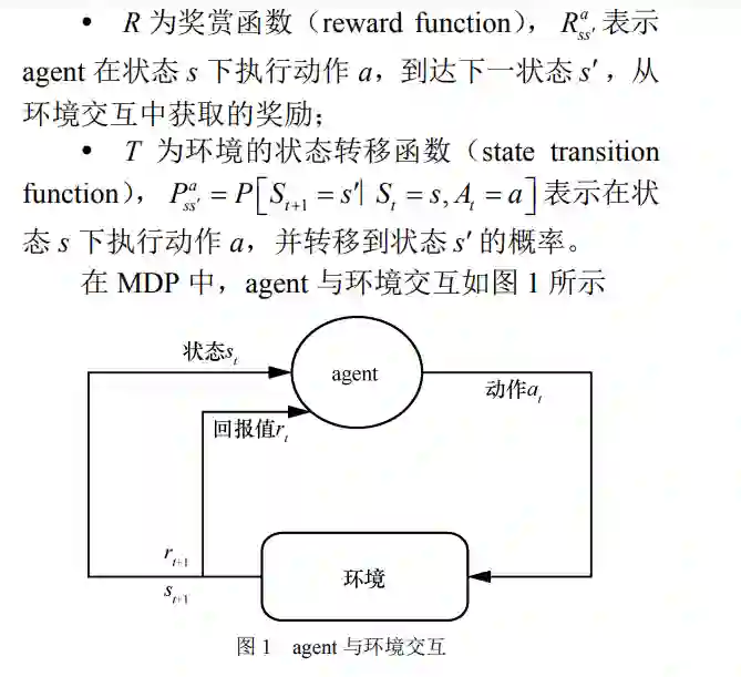 agent从环境中感知当前状态st,从动作空间A中选择能够获取的动作at;执行at后,环境给agent相应的奖赏信号反馈 rt+1,环境以一定概率转移到新的状态st+1,等待agent做出下一步决策。在与环境的交互过程中,agent有两处不确定性,一处是在状态 s 处选择什么样的动作,用策略π(a|s)表示agent的某个策略;另一处则是环境本身产生的状态转移概率