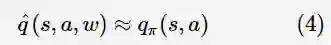 在基于值函数的强化学习方法中,主要是对价值函数进行了近似表示,引入了一个动作价值函数q,这个函数由参数w描述,以状态s与动作a为输入,计算后得到近似的动作价值,即式(4):