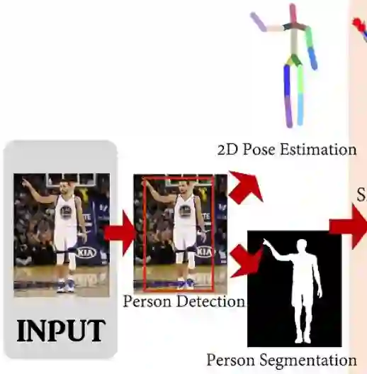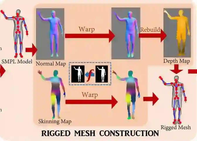 关键的难点在于中间部分,如何拿到人物的2D pose后,重建一个真实可用的3D骨骼蒙皮(Rigged mesh)?看看文章提出的方法: