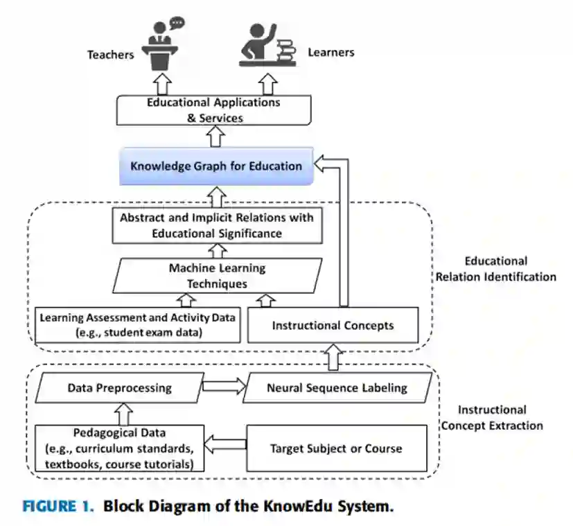 基于知识图的广泛应用和在教育领域日益增长的需求,作者提出了一个名为KnowEdu的系统,以自动构建教育知识图。通过利用教育领域的异构数据(如教学数据和学习评估数据),该系统首先提取科目或课程的概念,然后确定这些概念之间的教育关系。更具体地说,它在教学数据上使用神经序列标记算法来提取教学概念,并在学习评估数据上使用概率关联规则挖掘来识别具有教育意义的关系。