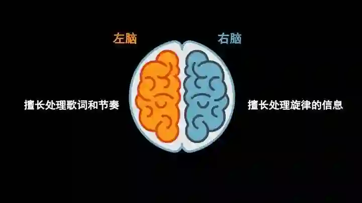 根据最新的科学研究的结果显示,我们的左脑可能更加擅长处理比较短的音节、节奏,还有就是比较擅长处理一些非音乐化的信息,比如词汇。但是我们的右脑可能就会比较擅长处理一些长一点的,旋律化的,音乐化的信息,所以唱歌是一个非常复杂的运动,也是一个全脑性的活动。