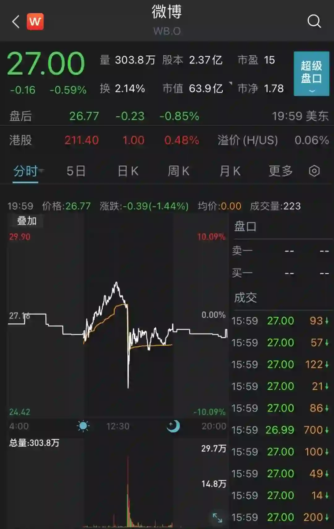 3月23日,SEC在“预摘牌名单”中新增微博。这导致微博美股股价盘中跳水跌幅一度达7%。截止收盘,微博下跌0.59%报27美元,市值64亿美元。