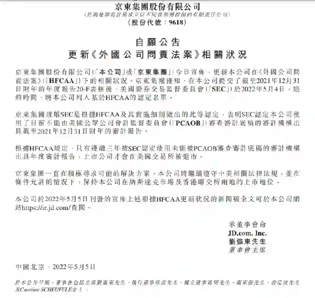 对此京东在港交所公告称,一直在积极探索可能的解决方案,将继续遵守中美两国的适用法律法规,努力保持在纳斯达克和香港联交所的上市地位。