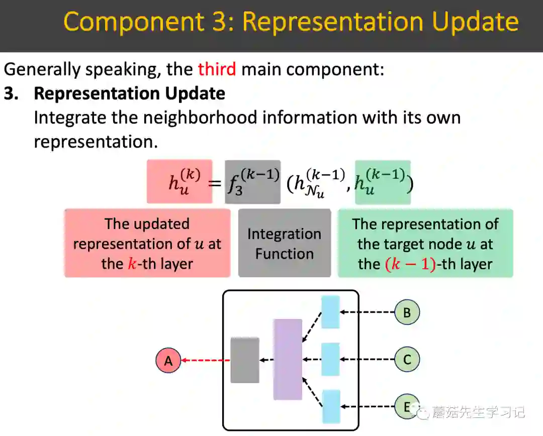 表征更新组件:负责将从邻域结点集合中收集到的信息和本身的信息做一个「融合和更新」。