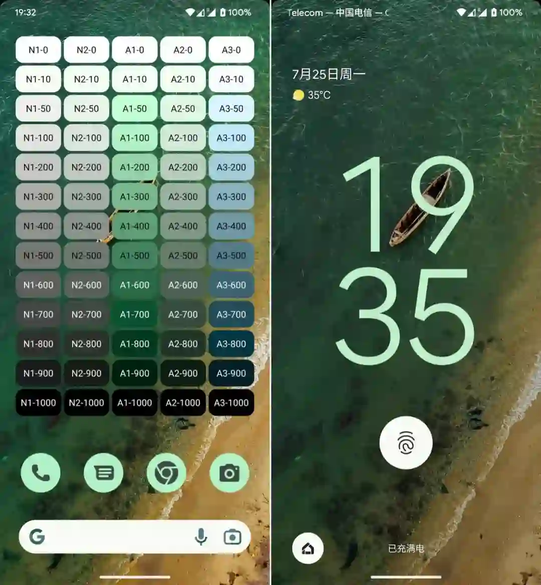 如果将 Android 13 的 Material You 动态取色彩蛋小组件添加到桌面,你会发现主题图标在深色主题关闭时默认提取 A1-100 的色值作为图标背景、N2-700 的色值作为单色图标主体的颜色。其中图标背景的色值和 Android 13 锁屏时间、快速设置面板开关等界面元素选取的色值是一致的。