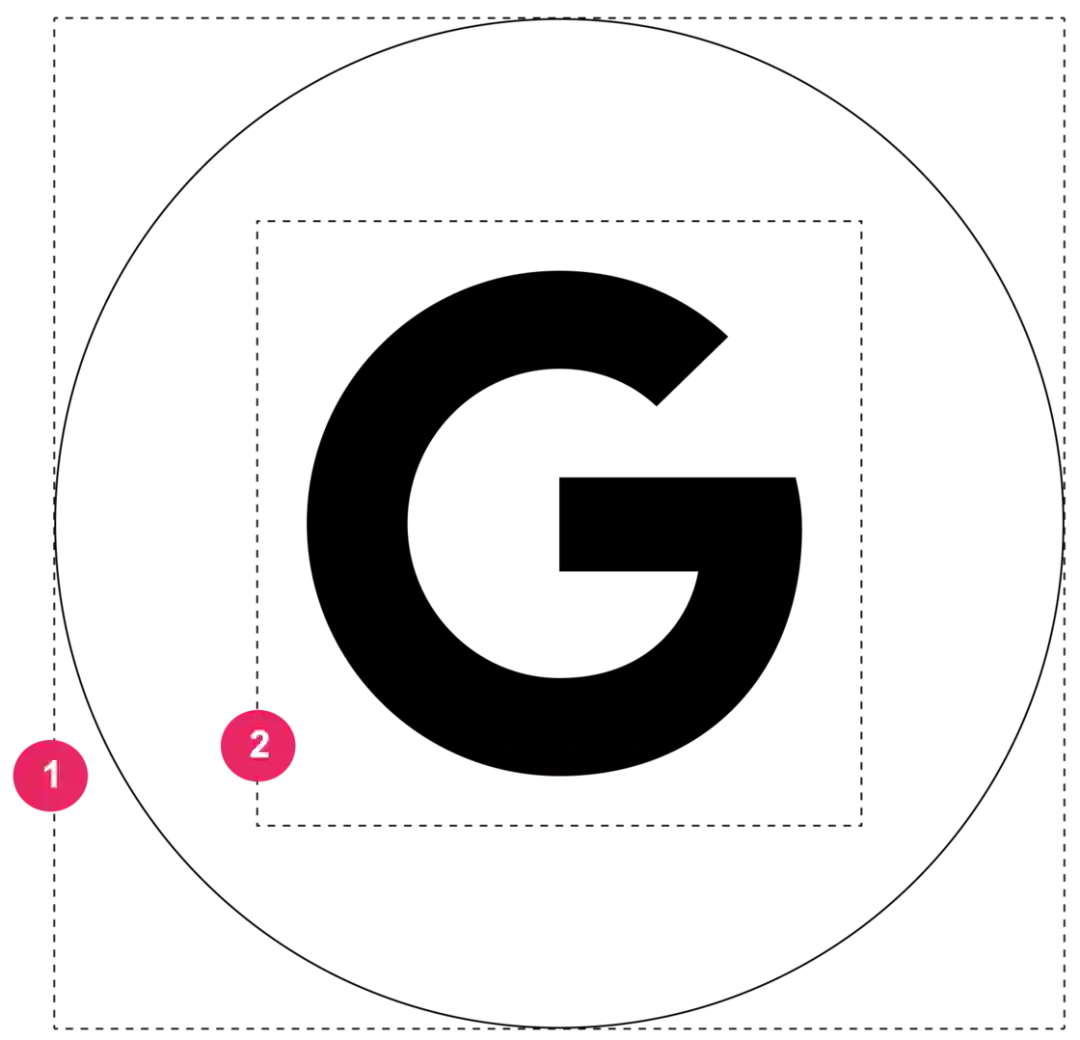容器区域 (1) 尺寸为 108x108dp,徽标区域 (2) 建议尺寸为 44x44 dp,最大尺寸为 72x72 dp | 图:Google
