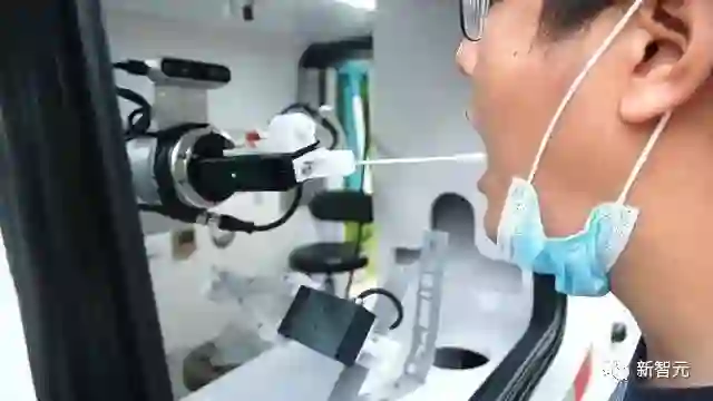 「请张嘴。」根据语音提示,记者脱下口罩、张开嘴巴,机器人的右臂电爪抓起一根棉签,慢慢地伸向喉咙。