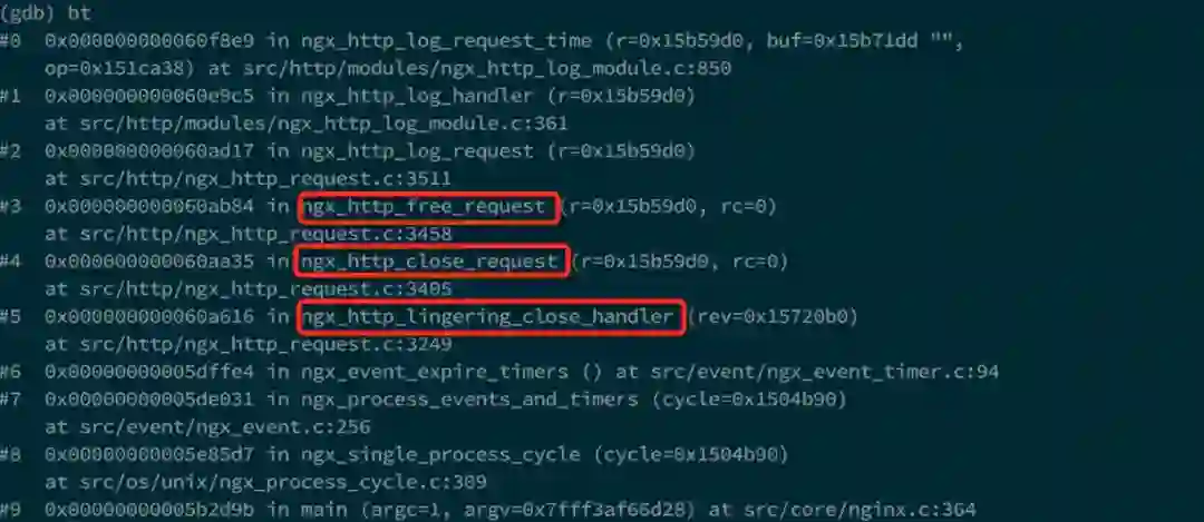 根据调用栈可以看到,在打日志之前,依次调用了三个红色框中的函数,它们都是用来处理连接关闭的。也就是说,在短连接的情况下,Nginx 只有在关闭与客户端的连接后才会开始输出日志,而不是给客户端发送完数据后就打日志。那么这个关闭连接的过程的耗时就很有可能是request_time 比 upstream_response_time 多出来的时间。我们接下来再来具体通过源代码看一下 Nginx 关闭连接的过程,主要的代码如下: