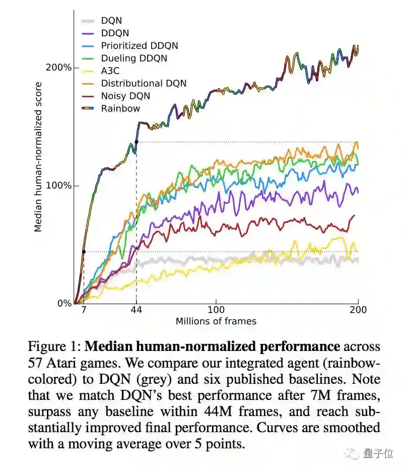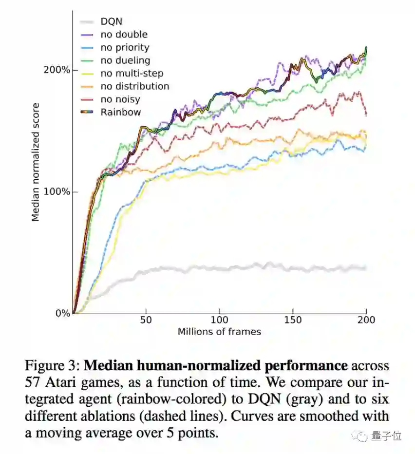 上图中彩虹色的是混血Rainbow,灰色的是原味DQN。横轴表示训练用的帧数,纵轴表示算法在雅达利游戏上的“人类标准中位得分”,也就是agent的得分与中等水平的人类相比,是百分之多少。
