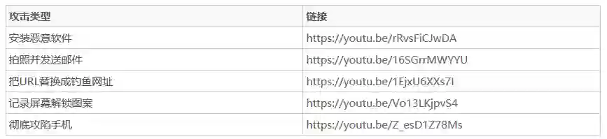 除了上文的视频,研究人员公布了五个视频,对应五种不同的攻击,包括安装恶意软件、拍照并发送邮件、把URL替换成钓鱼网站、记录屏幕解锁图案、彻底攻陷手机,而实验表明彻底攻陷手机只需要65秒,而其他诸如替换网址的攻击则是即时的。