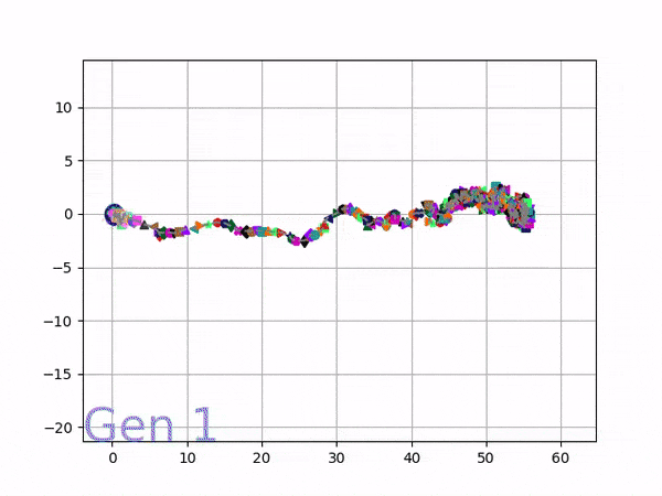 图 3 :可视化代际行为进化。每一代的颜色都会发生变化。在同一代中,每个伪子代的颜色强度基于该代适应度得分的百分位数 (聚合到五个仓中)。