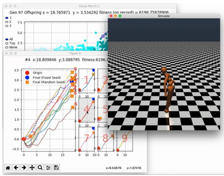 图 1 :经过遗传算法 (左) 和进化策略 (右) 训练的模拟机器人的行走情况。