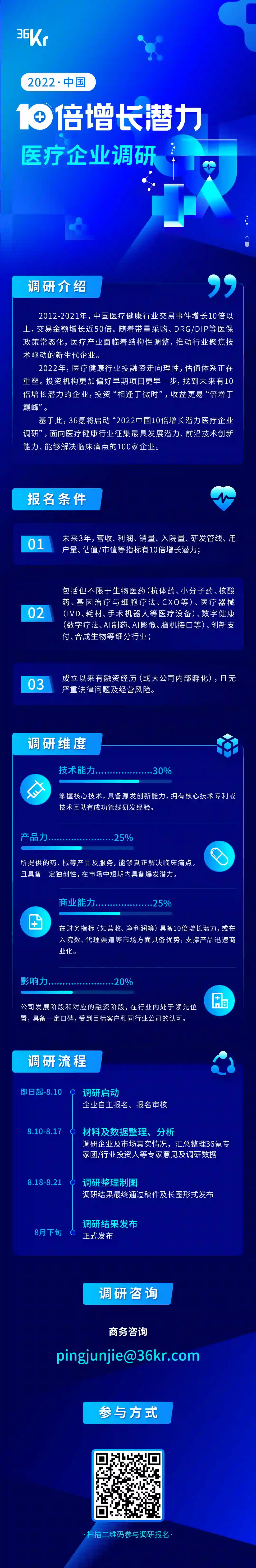 自即日起,「2022中国10倍增长潜力医疗企业调研」接受企业报名,报名将于8月10日截止;8月中旬,汇总整理36氪专家团/行业投资人等专家意见及调研数据,于8月下旬正式对外公布最终调研结果。