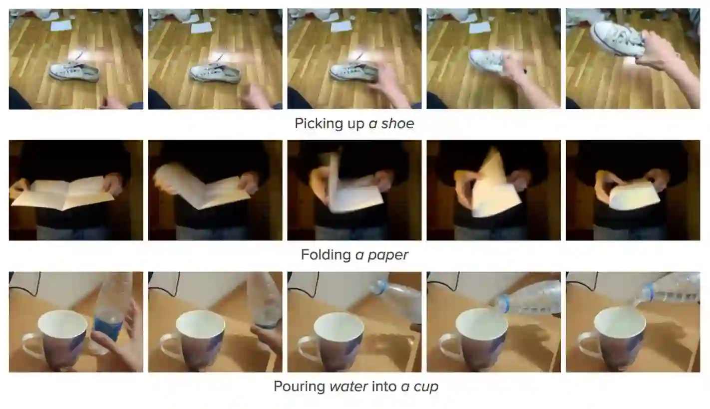 这个数据集包含 108,499 个标注视频片段,它们每一个的时长都在 2 到 6 秒之间。这些视频展示了 175 种类别的物体和动作。这些文字题注(captions)都是基于模板的文字描述,比如「把某物丢进某物」这种文字模板。模板往往包含「某物」的「窄条」(slots),就像物体的占位符号(placeholders)。这就给网络中从文本到视频的编码过程(text-to-video encoding)提供了附加结构,从而来增强学习效果。